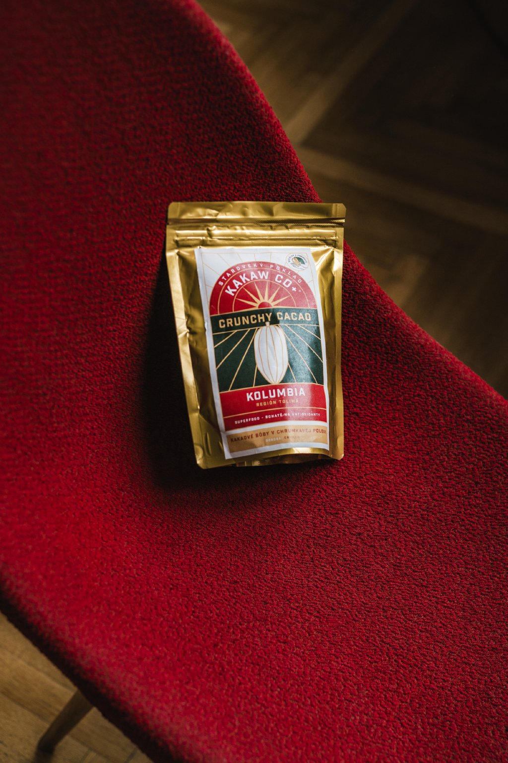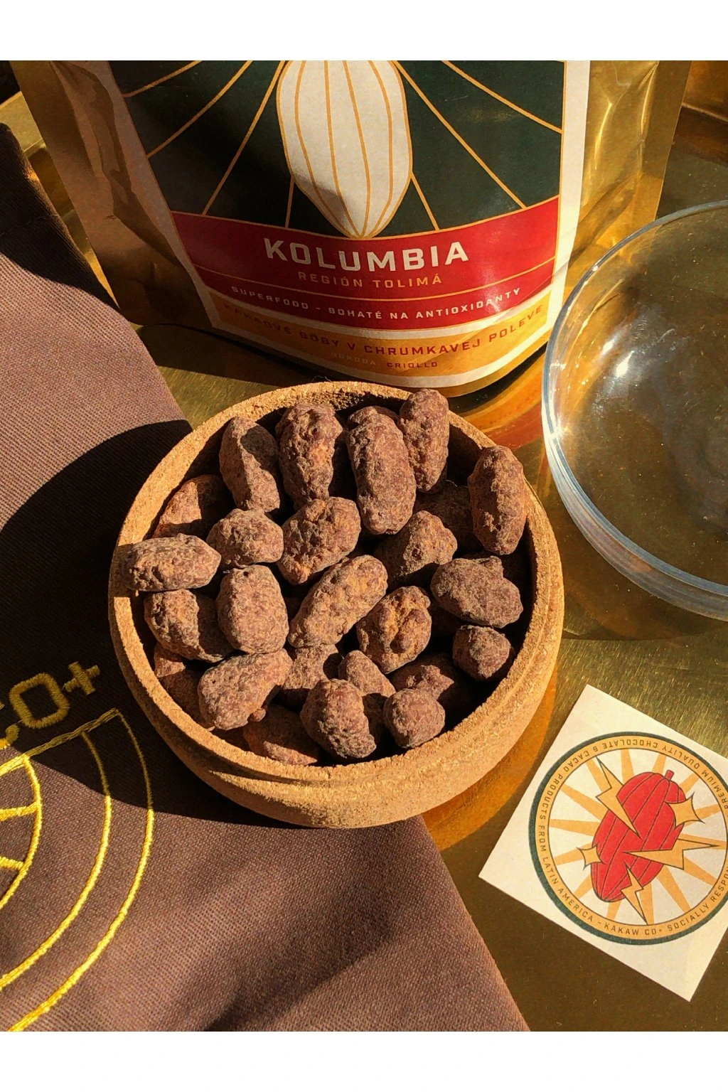 Lightly roasted cacao beans (fino de aroma) coated in a crunchy layer (cacao mass 55%, cocoa powder 100%, panela – dried unrefined sugar cane juice).
