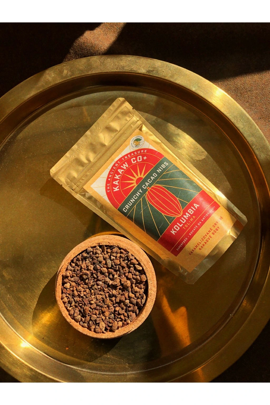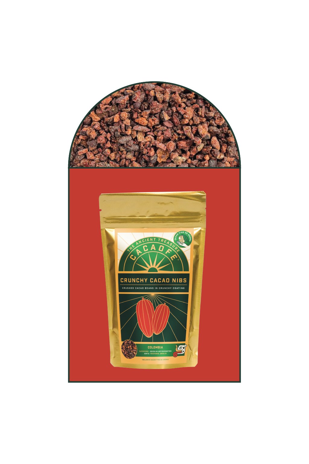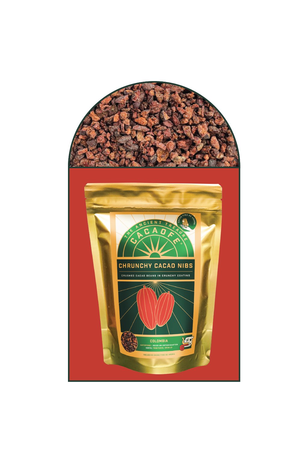 After crushing, the nibs are coated in a crunchy caramelised layer made with panela, an unrefined dried sugar cane juice. This creates a brittle, crisp shell that balances cacao’s natural bitterness with subtle sweetness while preserving the aromatic core of the cacao.