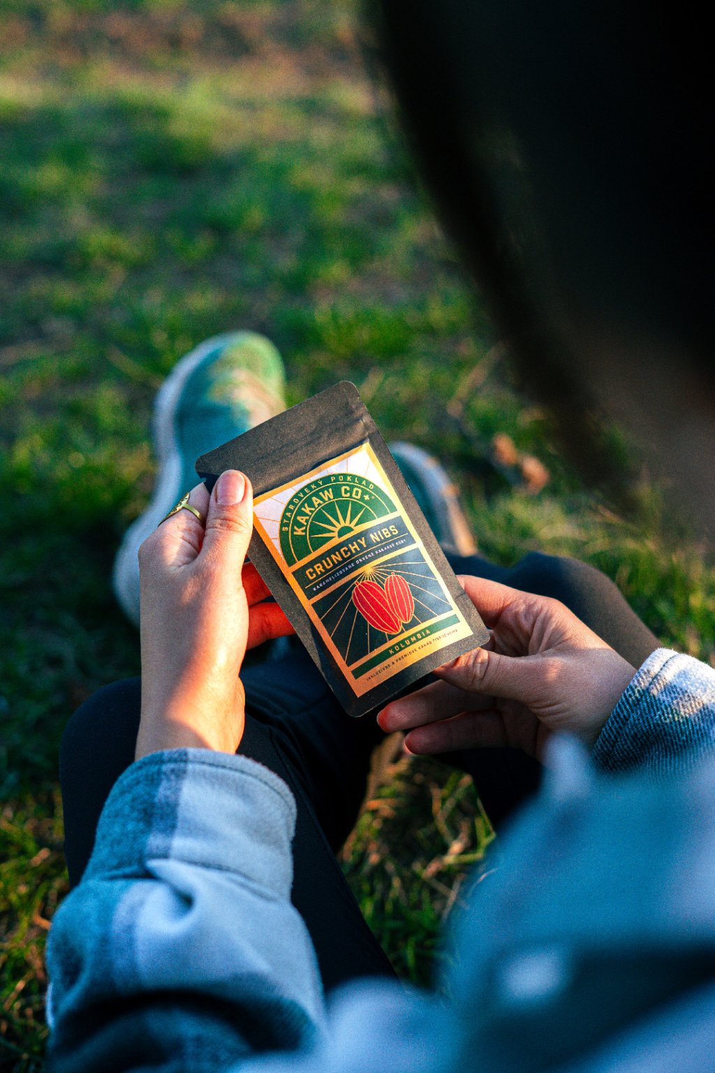 Lightly roasted cacao beans (fino de aroma) in a crunchy caramelised layer (panela – dried unrefined sugar cane juice).